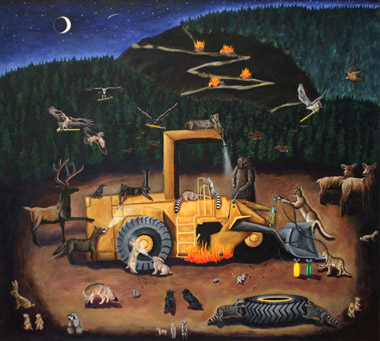 The paintings in this series are influenced by the nightmarish imagery of Hieronymus Bosch, Edward Abbey’s writings and my work as a wildlife rehabilitator and environmental activist. My art deconstructs the assumption of human superiority by showing what might transpire if animals took control over the fate of the planet. Animals demolishing the Glen Canyon Dam and wildlife laying waste to a bulldozer are some of the characters who populate my paintings.