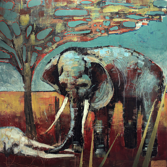 The textured paintings work in a similar vain as the prints. For most of these paintings, the artist used mix media to create the texture and line work.