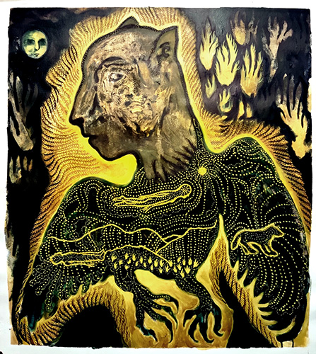 AD SOMNIA (to the dreams) refers to the ancient rite of incubation—to lie down in Latin—which involved sleeping in a temple or sacred place to receive visions and answers from a divine entity during dreams. This practice, widespread in many cultures, is reminiscent of the shaman’s journey, as in the Dream-man figure of Ugrian culture in Northern Europe. Céline Lyaudet felt deeply related to these ancient rites in her own dream experiences and dived into those images and symbols as a great source of inspiration for her painting work.